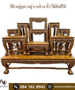 โต๊ะหมู่บูชา หมู่ 9 หน้า 8 นิ้ว ไม้เบญจพรรณแกะลายพิกุล(มีลิ้นชัก) ปิทอง